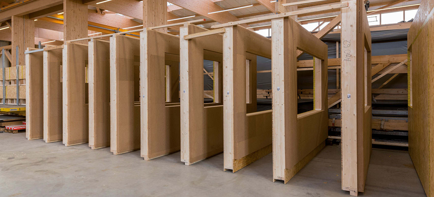 Dank unserer eigenen Fertigungsstraße für großdimensionierte Bauelemente sind wir in der Lage, geschosshohe Holzbausystemwände zu realisieren. Damit können wir den gesamten Bauprozess wesentlich verkürzen, bei gleichbleibender Qualität, hoher Individualisierbarkeit und Funktionalität. Die von uns erstellten Komponenten übernehmen tragende, dämmende und dichtende Eigenschaften, werden von uns mit Fenstern und haustechnischen Komponenten vorgefertigt und mit der gewünschten Bekleidung der Innen- und Außenwände versehen.