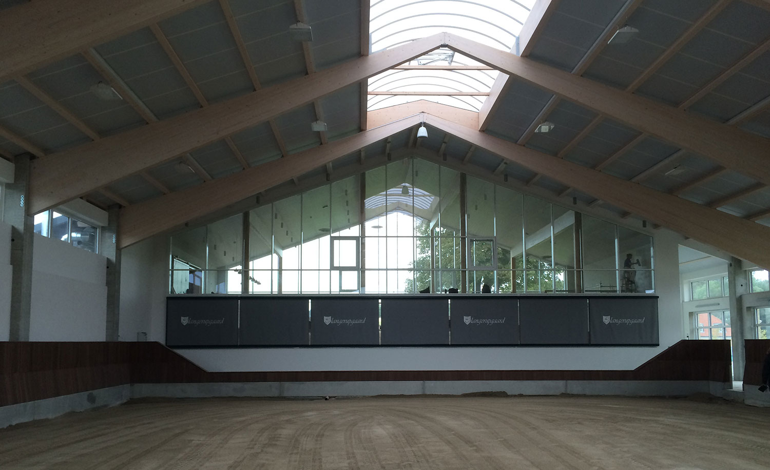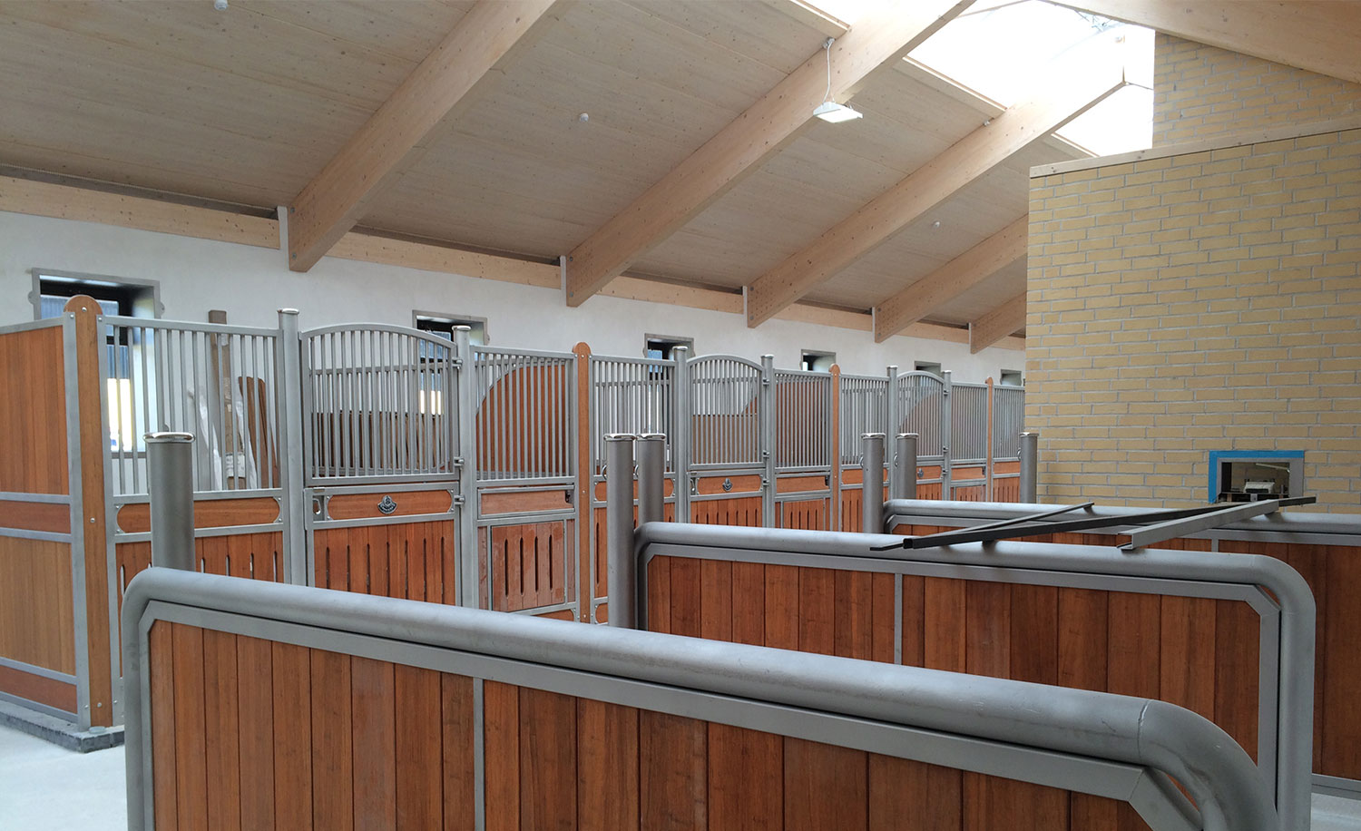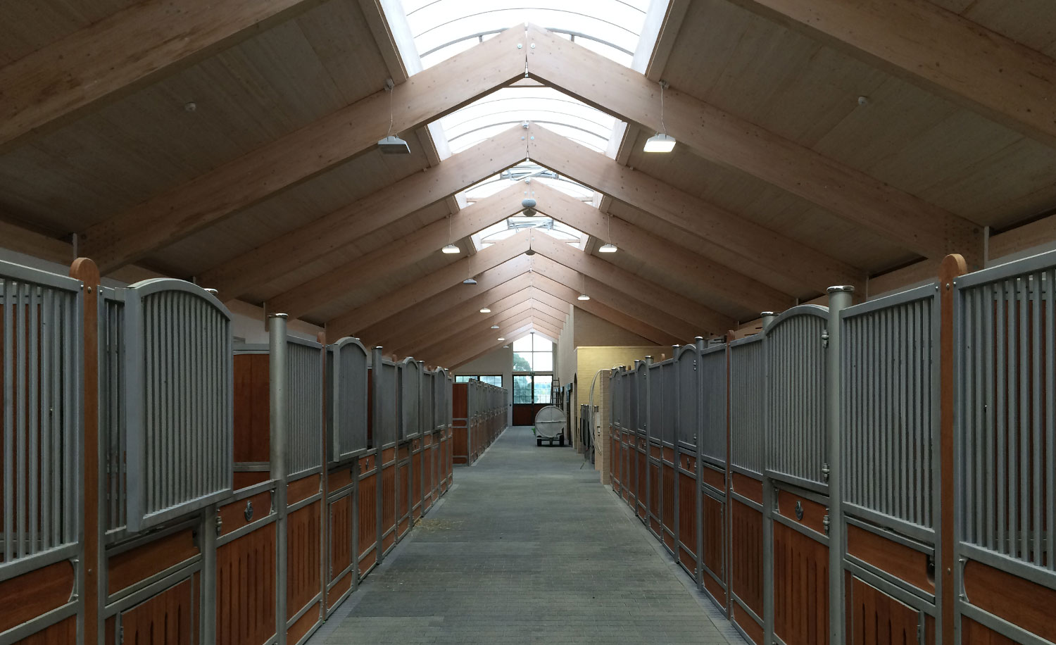 Der Stallbereich punktet mit großen Boxen und viel Helligkeit. Die Höhe des Gebäudes sorgt stets für genug Frischluft. Das komplette Dachtragwerk wurde als Dreigelenkkonstruktion ausgeführt.