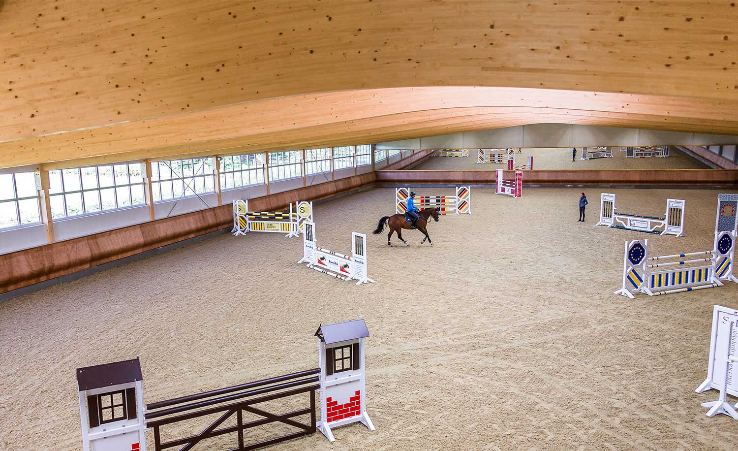 Die Reithalle mit dem Hufschlagmaß 32 x 60 Meter bildet das Herzstück der Anlage des Bauherrn und garantiert beste Bedingungen für das Training der Pferde. Mit einer Cape-Cod- und Alu-Glas-Fassade werden hier besondere Highlights gesetzt.