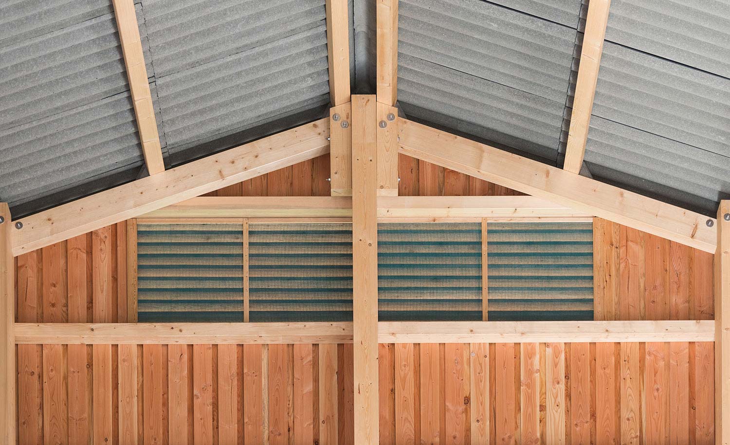 Um das Be- und Entladen zu ermöglichen, wurde ein zweiflügeliges Schiebetor errichtet, das auf einer gestemmten Holzrahmenkonstruktion basiert. Der Fuhrpark lässt sich unter einer 120 m² großen Remise unterstellen.