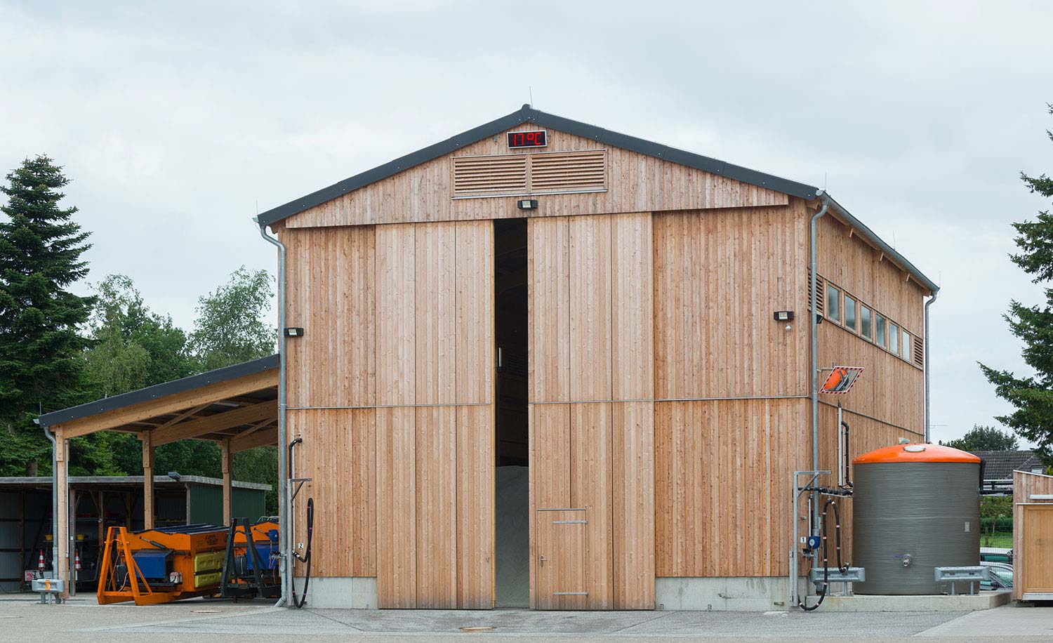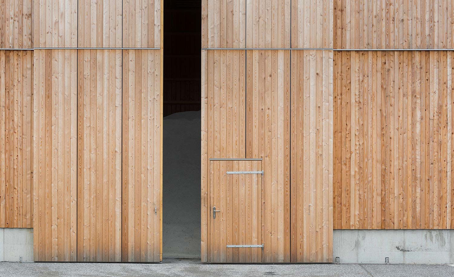 Die Halle mit rund 250 m² Grundfläche dient der Lagerung von Streustoffen (Salze). Die Firsthöhe beträgt gut elf Meter, umlaufend wurden bis zu einer Höhe von 3,50 Meter Schüttwände aus einer BSH-Riegelkonstruktion mit einer vorgesetzten Mehrschichtplatte gestellt. Die Fassade erhielt eine Verkleidung aus einer Lärchen-Deckelschalung.
