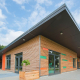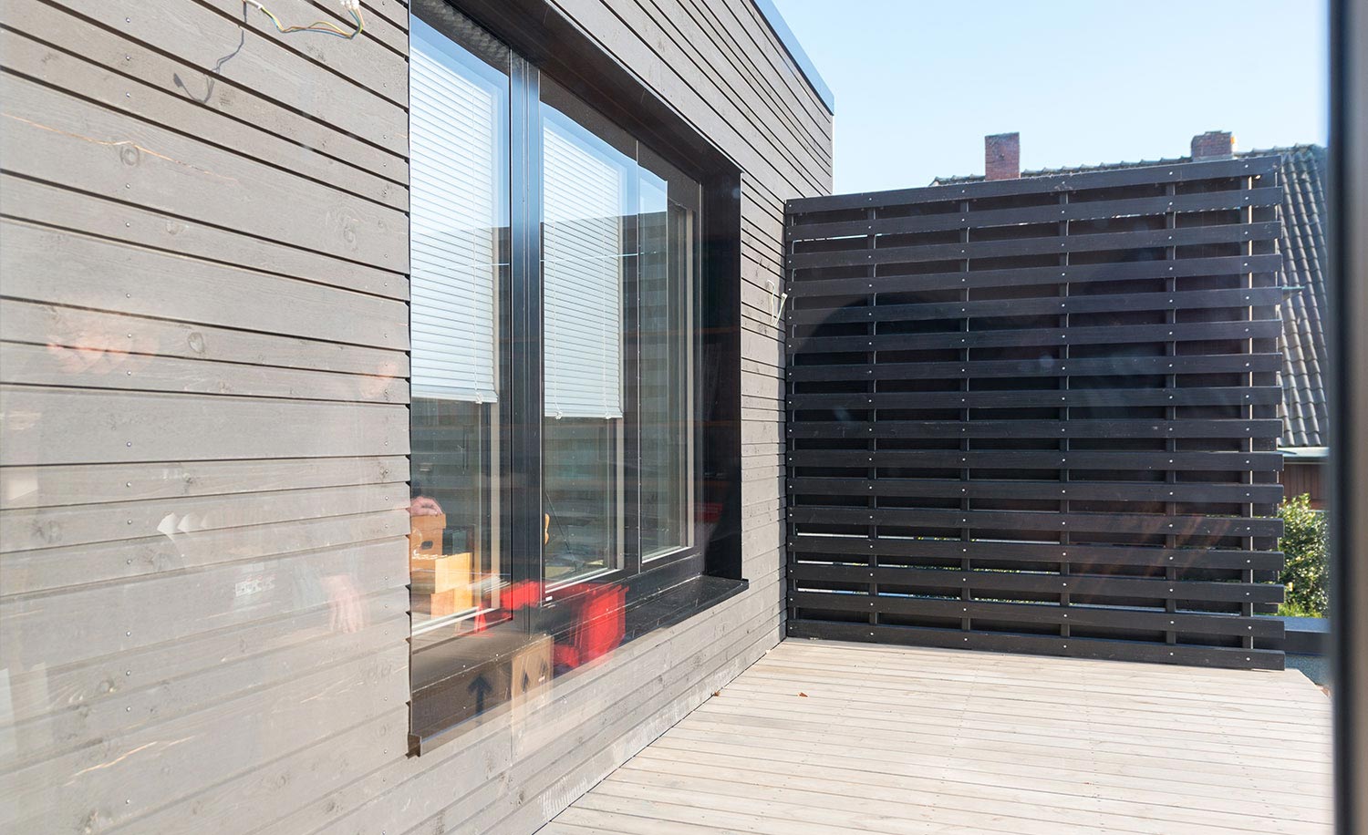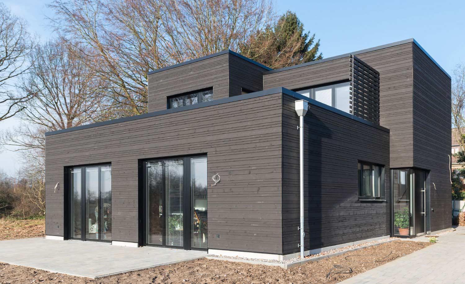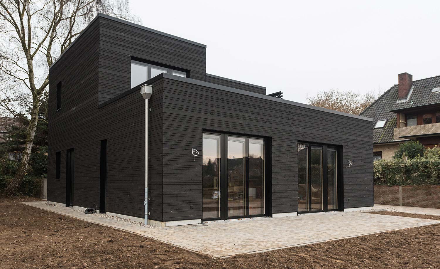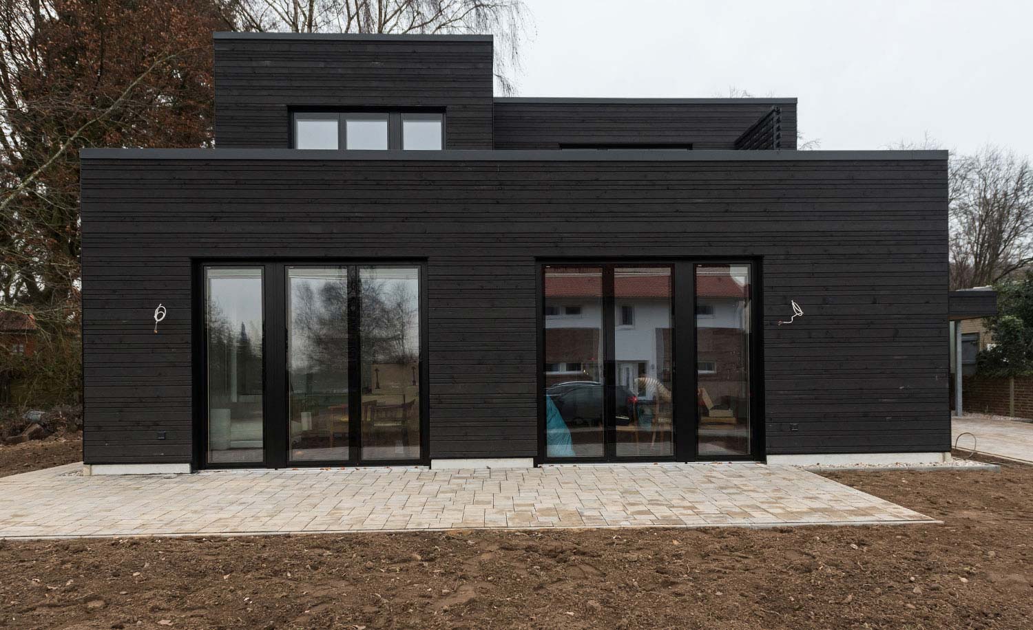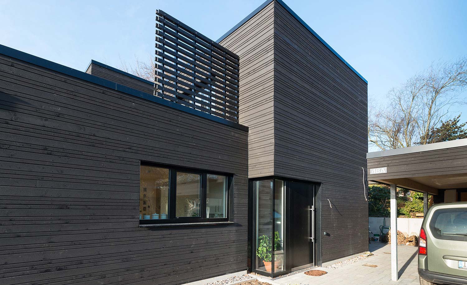 Sowohl die Innen- und Außenwände als auch die Zwischendecken des Einfamilienhauses wurden im Werk vorelementiert. So konnten sie am Bauort in kürzester Zeit aufgestellt werden. Das gesamte Wohnhaus wurde mit Wechselfalzbrettern aus nordischer Fichte in einem matten Schwarz verkleidet. Gleiches gilt für zwei zugehörige Abstellräume und einen Carport, die zudem ein Gründach erhielten.