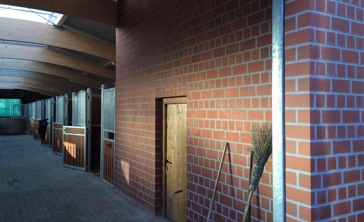 Um den Bau des Pferdestalls zu realisieren, galt es zunächst, Beton- und Pflasterarbeiten auszuführen. Es folgten die Stellung der Konstruktion, die Dacheindeckung, die Stellung der Außen- und Innenwände, der Einbau der Lichtbänder und -firste und der Türen.