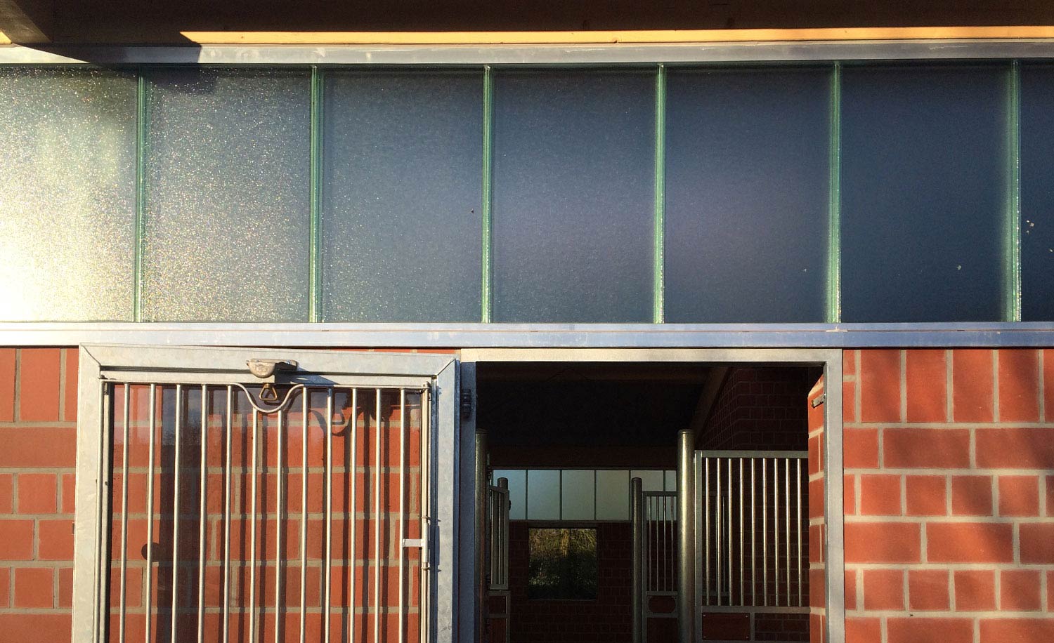 Die Dachkonstruktion besteht aus acht Satteldachbindern aus gebogenem BSH. Die Giebeldreiecke sind mit einer Lärchenschalung verkleidet, die übrigen Außenwände wurden verblendet. An den Stallseitenwänden wurden mehr als 60 laufende Meter U-Bauglas verarbeitet. Ein 24,5-Meter-Lichtfirst sorgt zusätzlich für viel natürliches Licht im Stall.