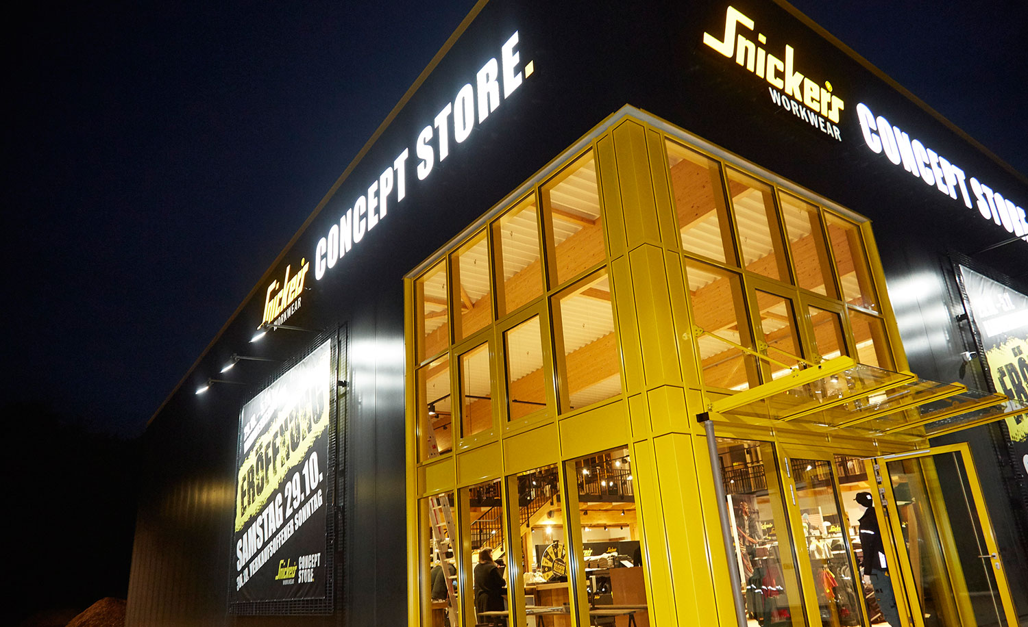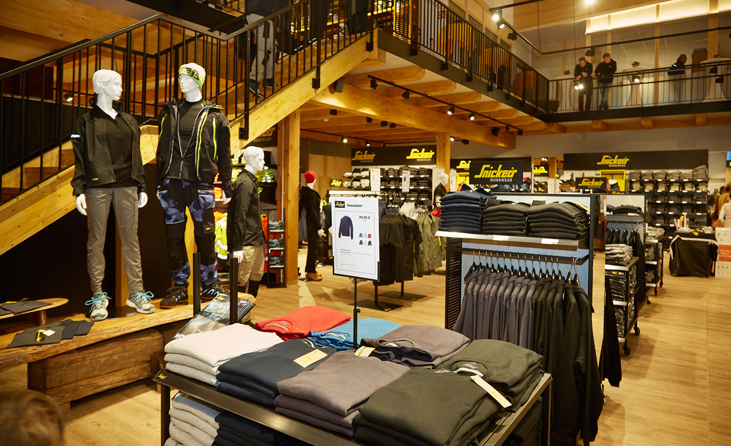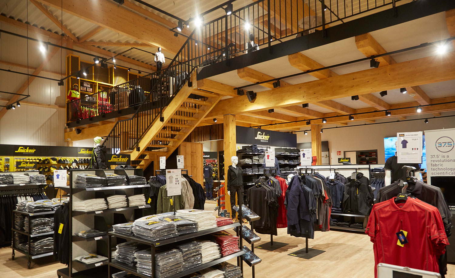 In Kaltenkirchen ist der größte Snickers Workwear Store in Europa entstanden: Neben mehr als 500 m2 Ausstellungsfläche verfügt das Erdgeschoss über Haustechnik- und Sanitärräume sowie einen Bereich für die Warenannahme. Eine BSH-Wangen-Treppe führt ins Obergeschoss, in dem sich neben einer großzügigen Galerie ein Showroom und Büros befinden.