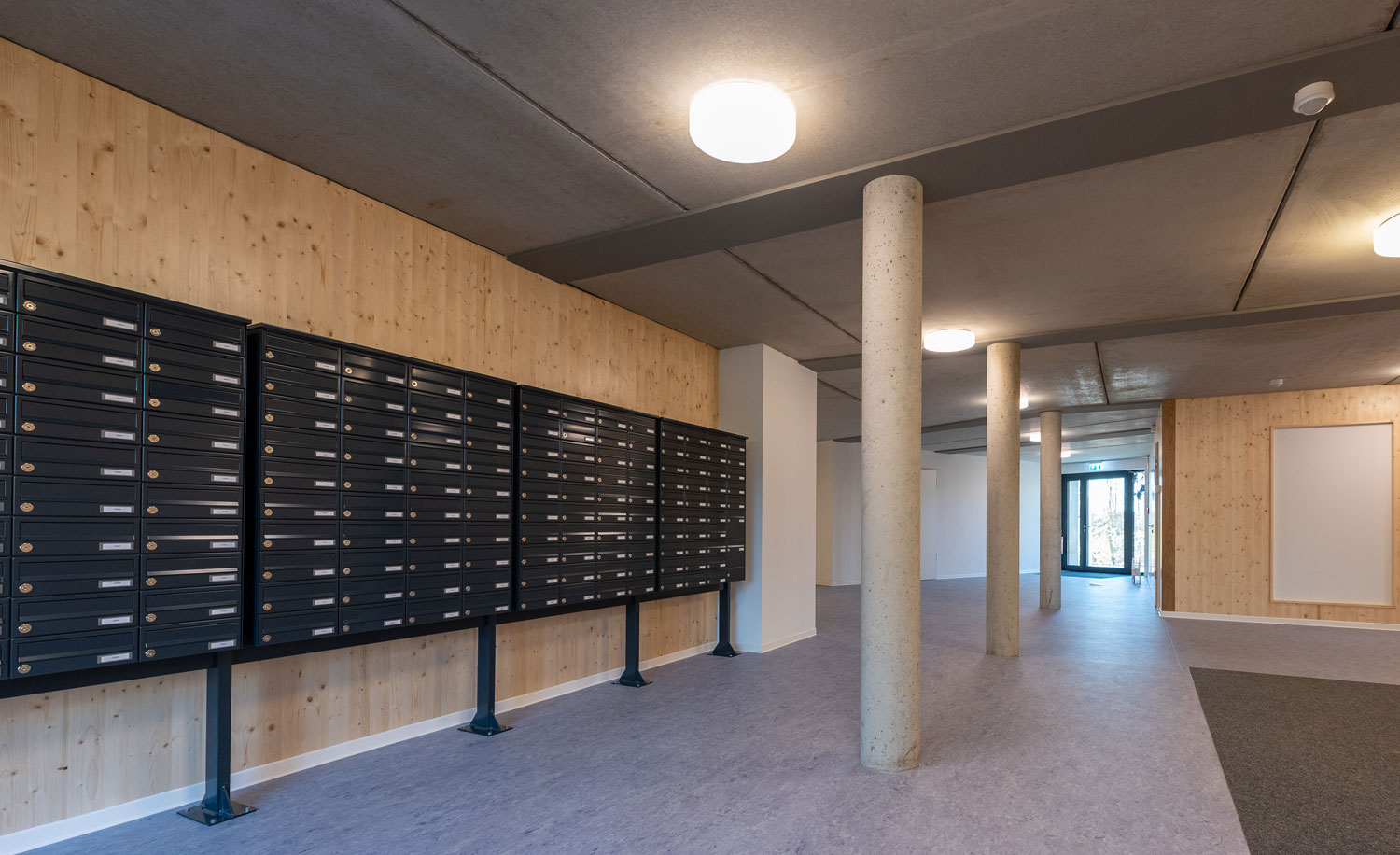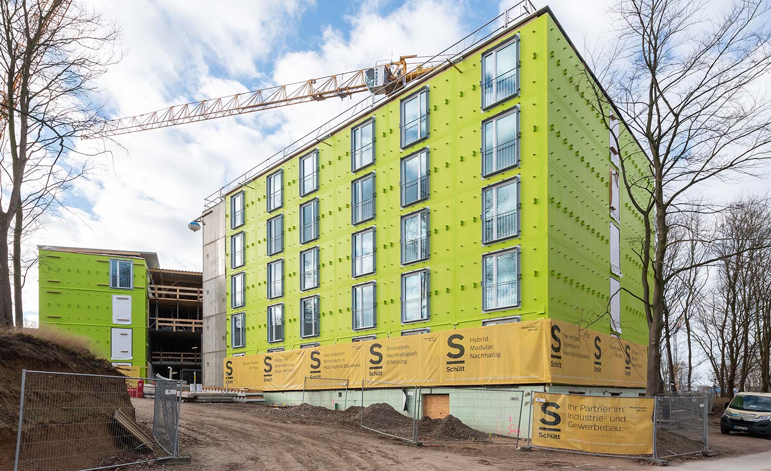 Besonderheiten: Realisierung in Holz-Hybrid-Bauweise, weitgehender Einsatz von vorgefertigten,