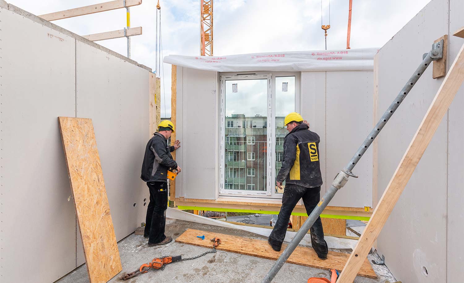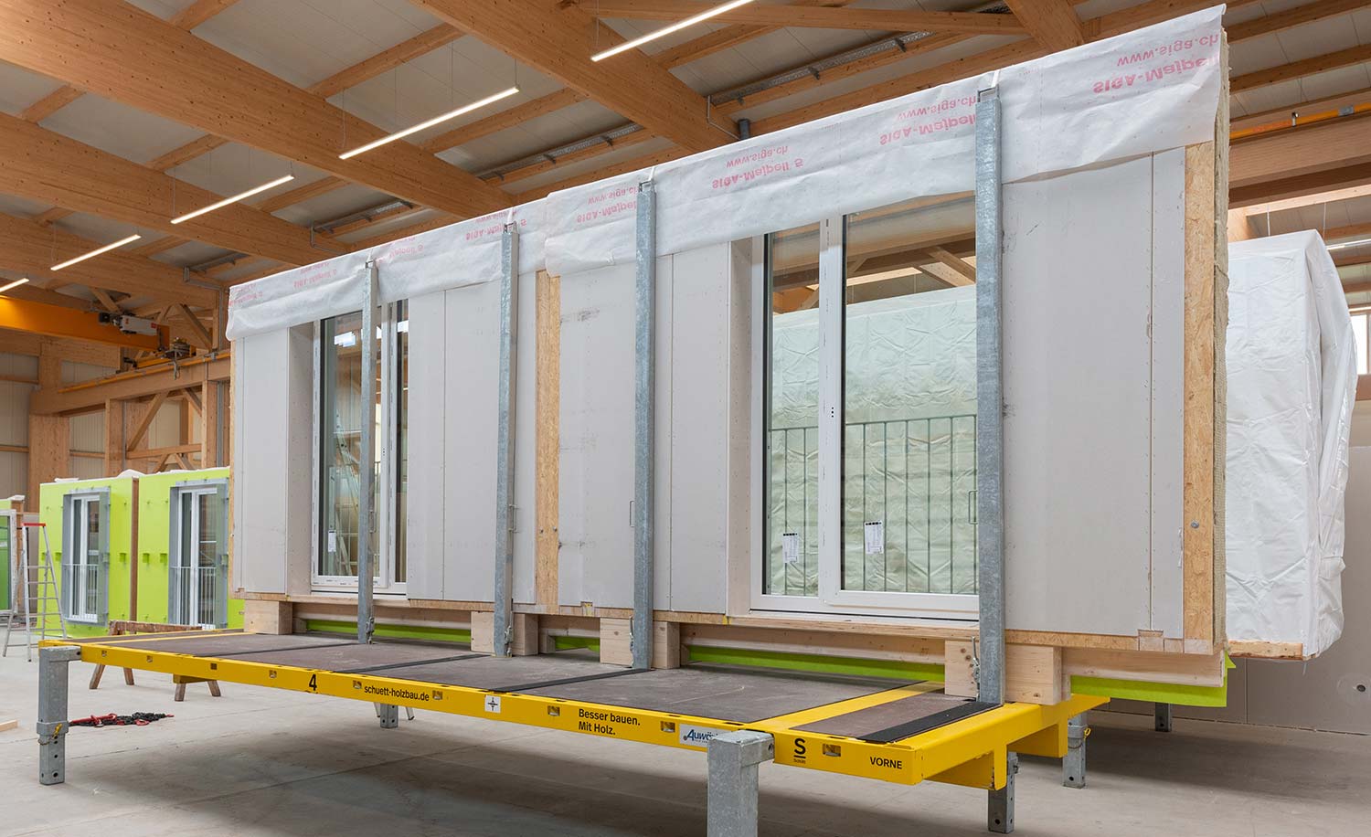 Das Gebäude wird in Holz-Hybrid-Bauweise, hauptsächlich mit den Baustoffen Holz- und Stahlbeton erstellt. Dabei werden weitgehend vorgefertigte, modulare Bauteile wie Raumzellen, Wand- und Deckenelemente sowie Schächte verwendet. Alle Bauteile werden auf unserer werkseigenen Fertigungsstraße seriell vorgefertigt.